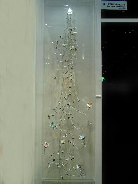 下中=高橋治希の陶器の花の簾は実に繊細な作品[Tokyo vine -waterfall-]である。花や枝ぶりなどすべてのエレメントは、多治見焼で3週間かけて焼かれたものである。花の中には東京の風景が描かれている。