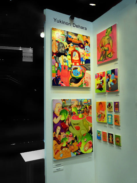 下中=ブースの中にはいると、フィギュアイラストレーターのコミックをベースとした[ゾンビこども]たちが異彩を放っている。家庭内暴力で殺された子どもたちが大人に復讐する話なのである。一見、残酷な絵柄だがその豊かな色彩は浄瑠璃の色使いを彷彿とさせる(携帯コミック配信時に、内田勝(故人)がデハラ作品をみてそう喝破した)