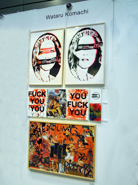 下左=小町渉の強烈なパンク作品群。すべて色味の違うシルクスクリーンやポルノグラフィを利用したコラージュなど平面作品であるにも関わらず、ギターやドラムのパンキッシュな雰囲気を醸し出している。