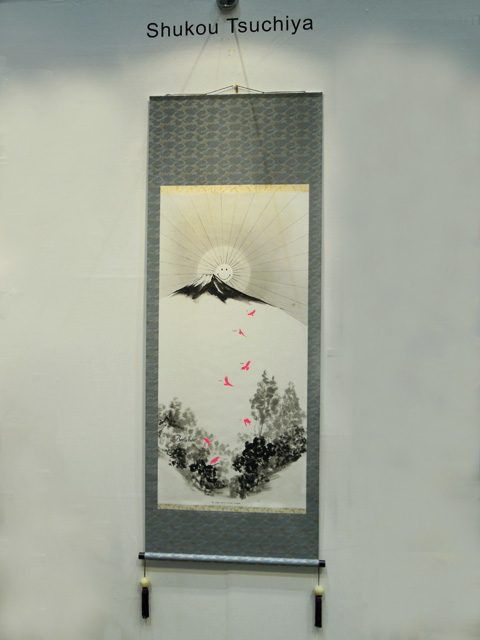 下中=土屋秋恆の御軸[Fluorescence Animals, Peace, Fuji]が伝統と現代を交差させる。水墨に都市の象徴であるカラスが蛍光ピンクのアクリルで加筆されている。