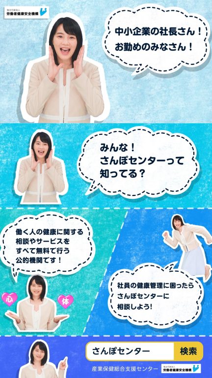 “のん”が、こころとからだの健康を全力で応援する”さんぽセンター”の案内をしています。
