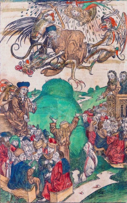 木版画の左端に、民衆をあおる預言者にデマを耳打ちする悪魔の姿がいる。デマの流布も現在の状況に酷似している。