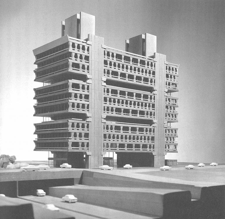 (写真は、当時の電通社長吉田秀雄から本社ビルの設計を依頼された建築家 丹下健三が設計した模型 ) 「築地再開発計画」(1964)の一部。